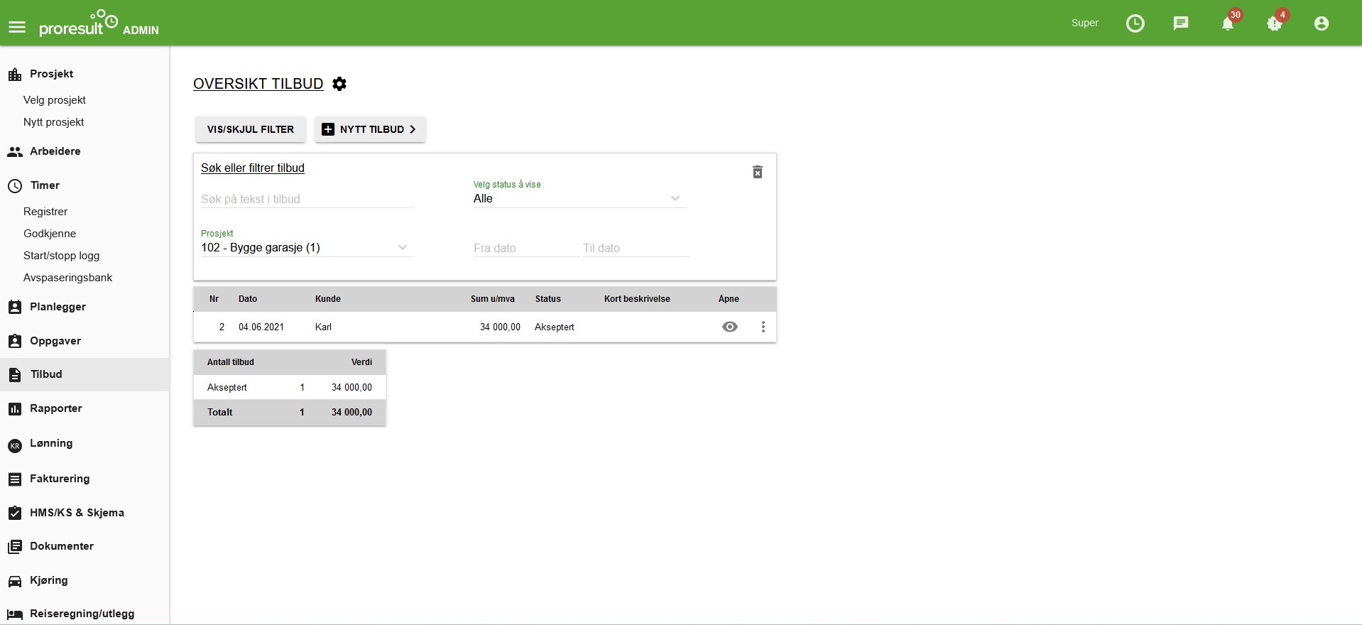Man får status på om tilbudet ble avvist eller akseptert. Ved aksept kan man opprette et prosjekt direkte i tilbudsmodulen.
